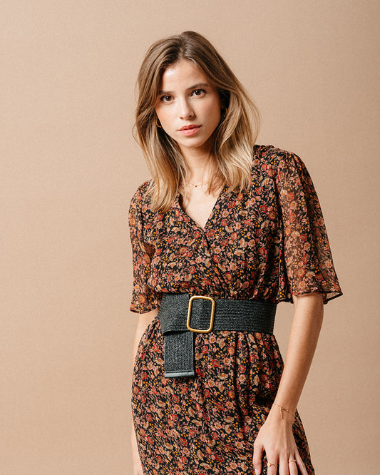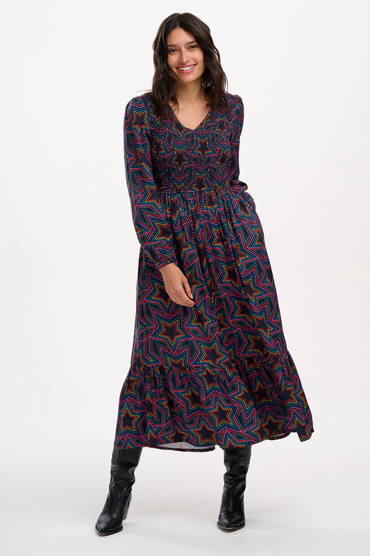 Amberley Midi Shirred Dress - Black, Rainbow Star Explosion