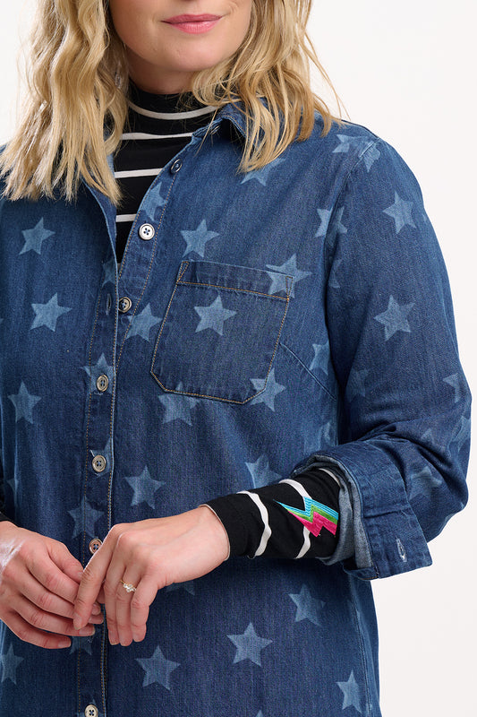 Ilsa Mini Shirt Dress - Mid Blue Denim, Bleached Stars