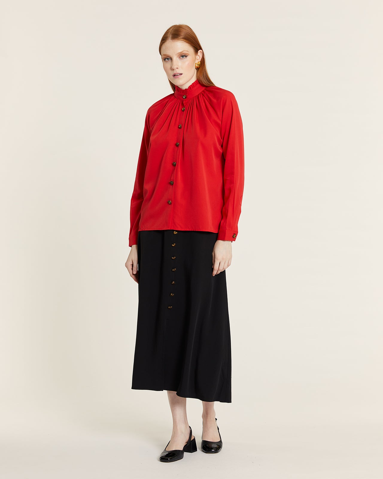 Flared skirt with a center front slit, a rigid, non-elastic waistband, and decorative heart-shaped buttons that add a sweet, feminine touch.