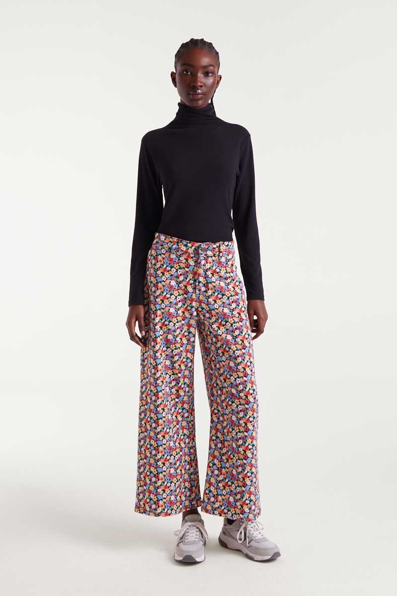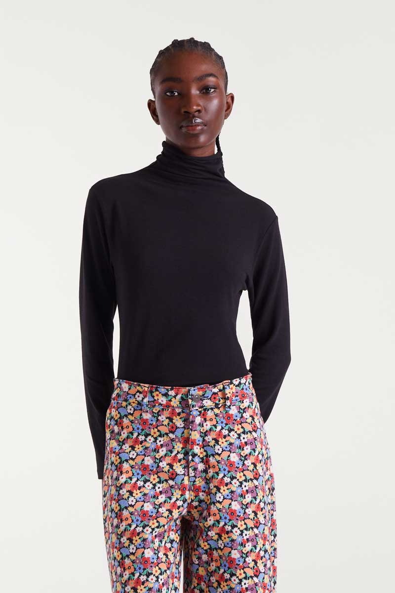 Black T-shirt with a high neck and long sleeves. The model is 179 cm tall and is wearing a size S.