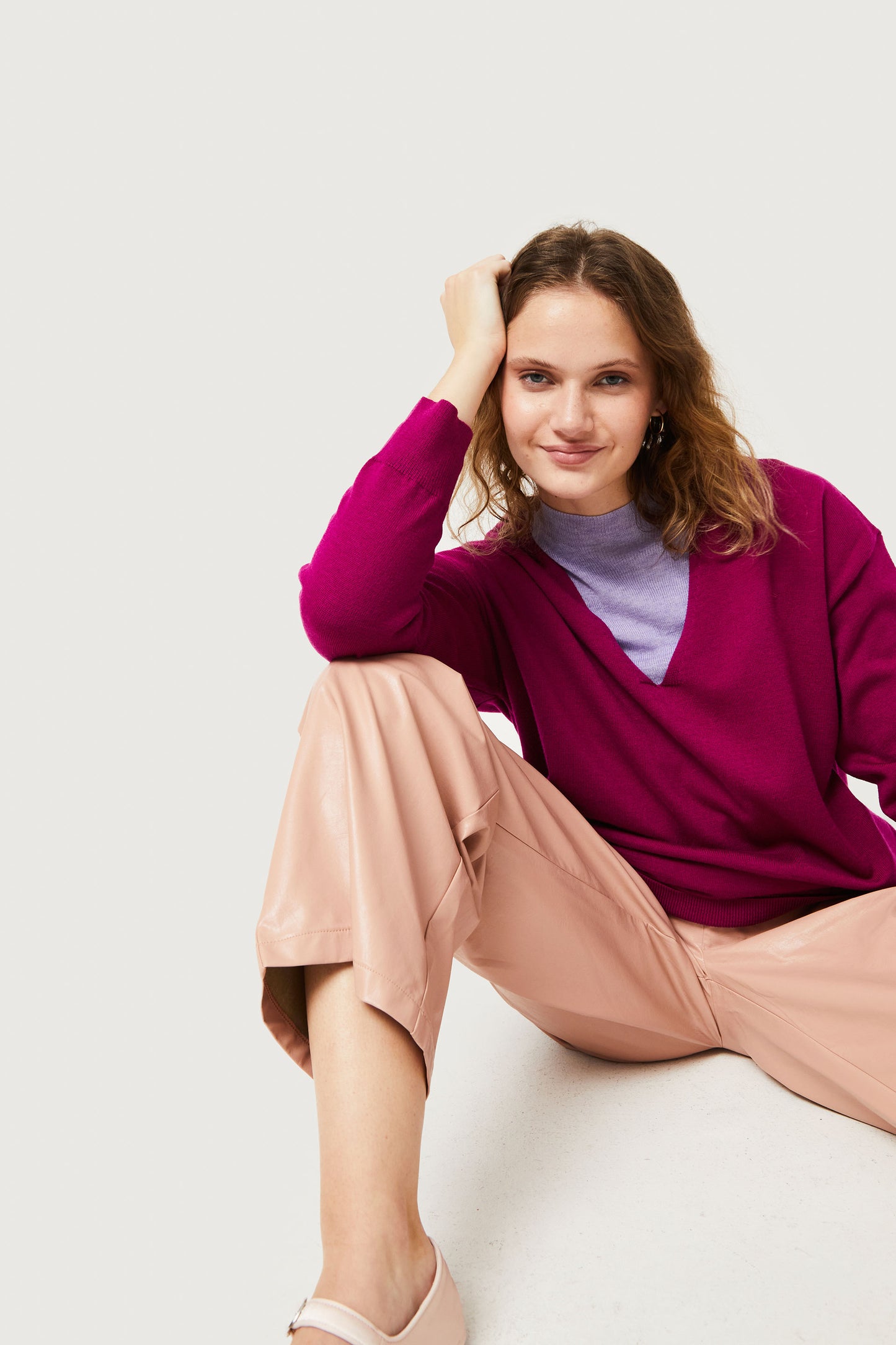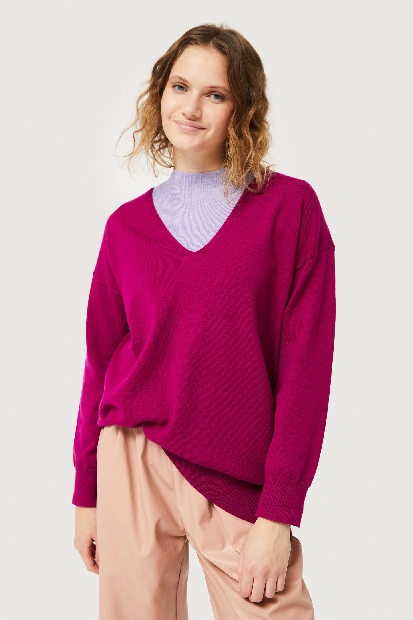 Fuchsia knitted sweater. With a V-neck and long sleeves with slightly dropped shoulders. The model is 175 cm tall and wears size S.