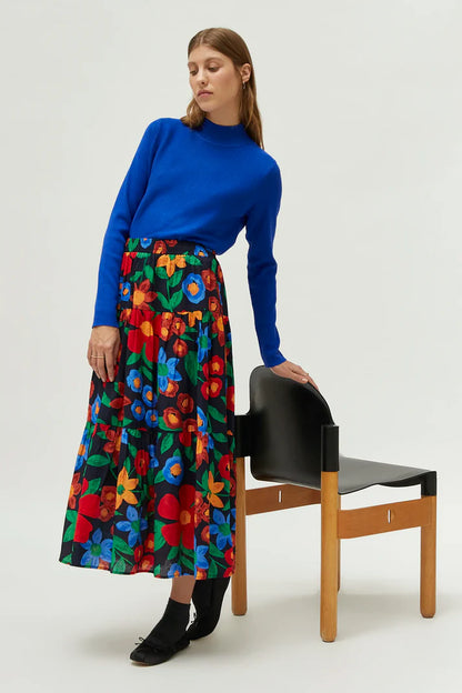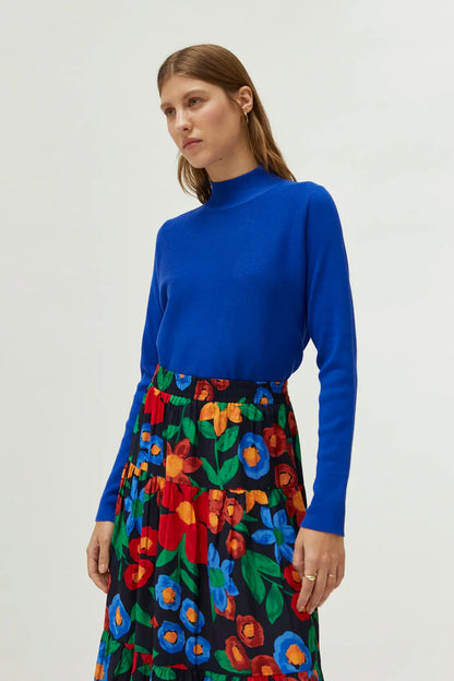 Blue knitted sweater. With mock neck and long sleeves. Evasé cut model. The model is 177 cm tall and wears size S.