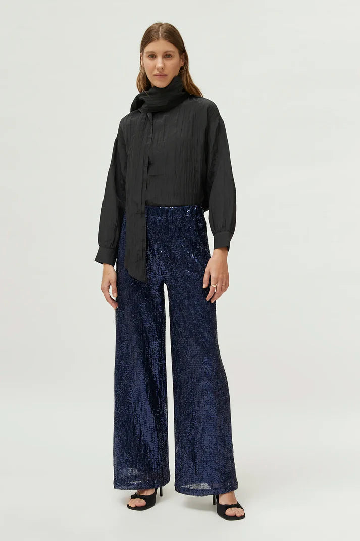 Navy blue sequin long trousers. With high-rise elasticated waist and wide leg. Lined interior. The model is 177 cm tall and is wearing size S.