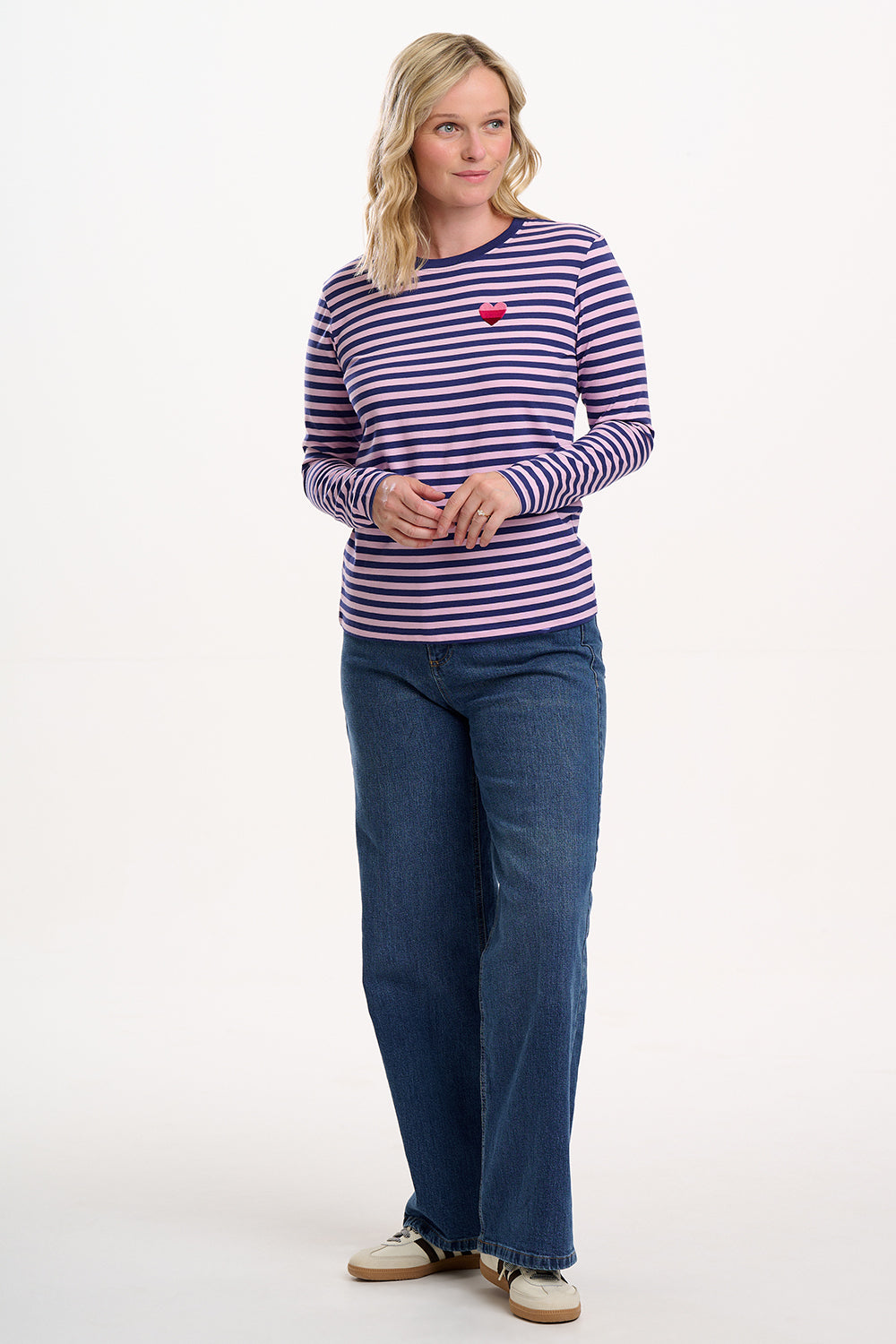 The signature loose fit Brunswick design features a relaxed long sleeve t-shirt cut and a contrasting crew neck collar. The Ombre Heart design has a retro feel with muted horizontal stripes of navy and lilac, finished with a contrasting navy collar and embroidered with an ombre heart on the bust.