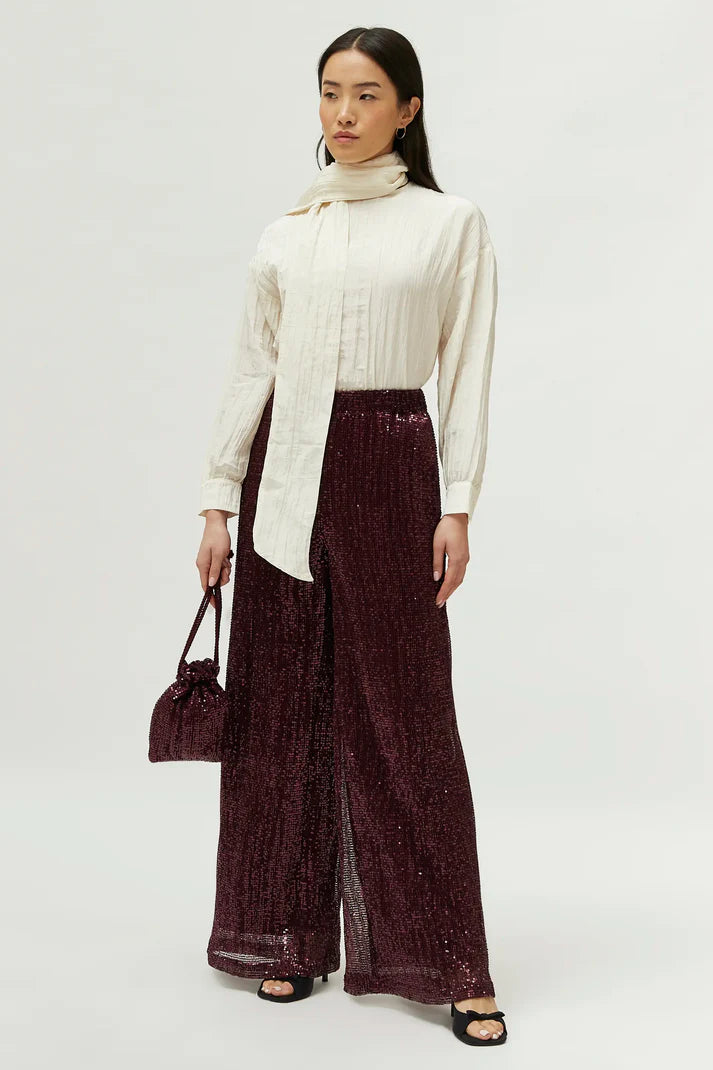 Long burgundy sequin pants. Featuring a high-rise elastic waist and wide leg. Inner lining. The model is 171 cm tall and wears size S.