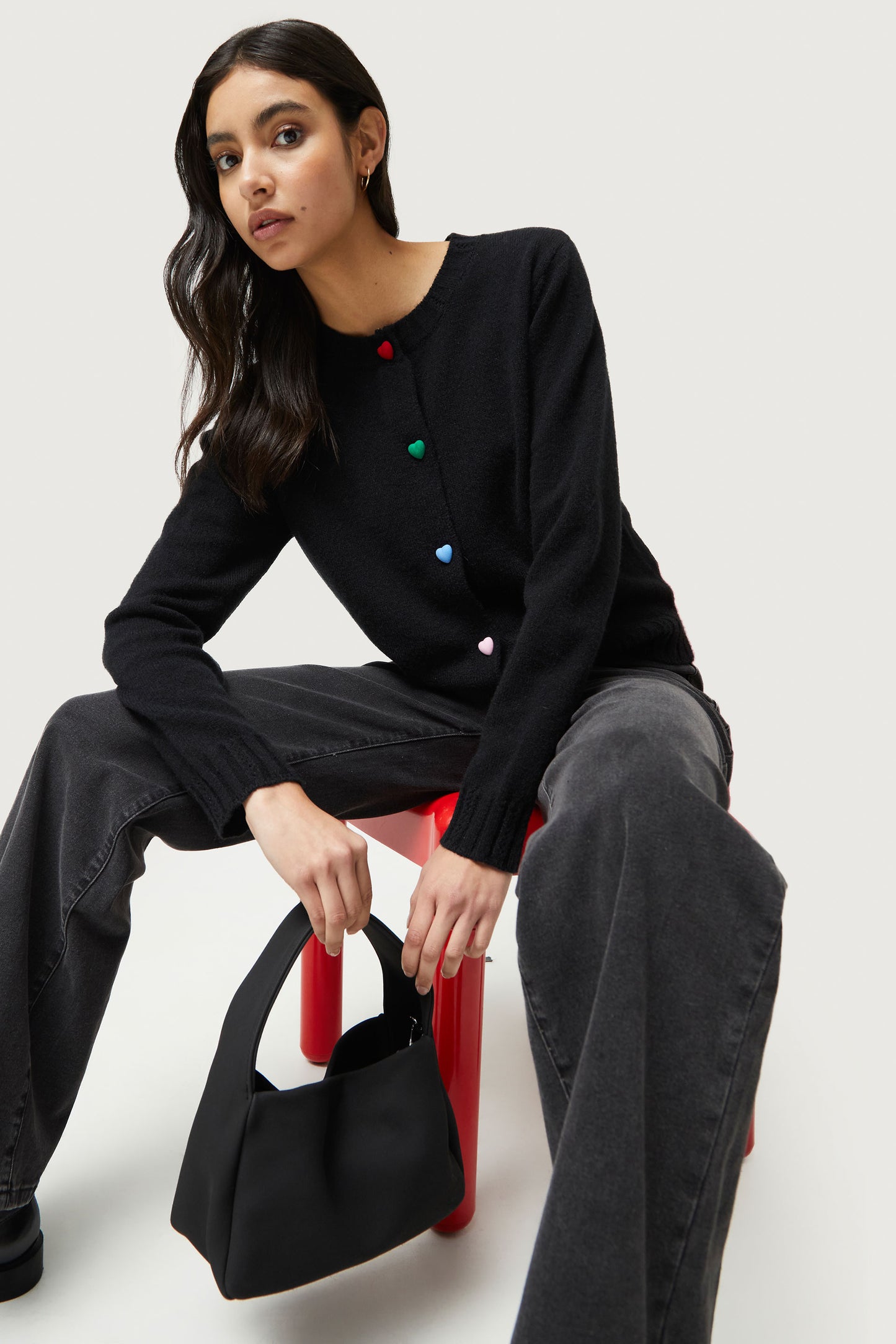 Black knitted cardigan. With a round neck and long sleeves. Front closure with multicolored heart-shaped buttons and ribbed trim detail. The model is 176 cm tall and wears size S.