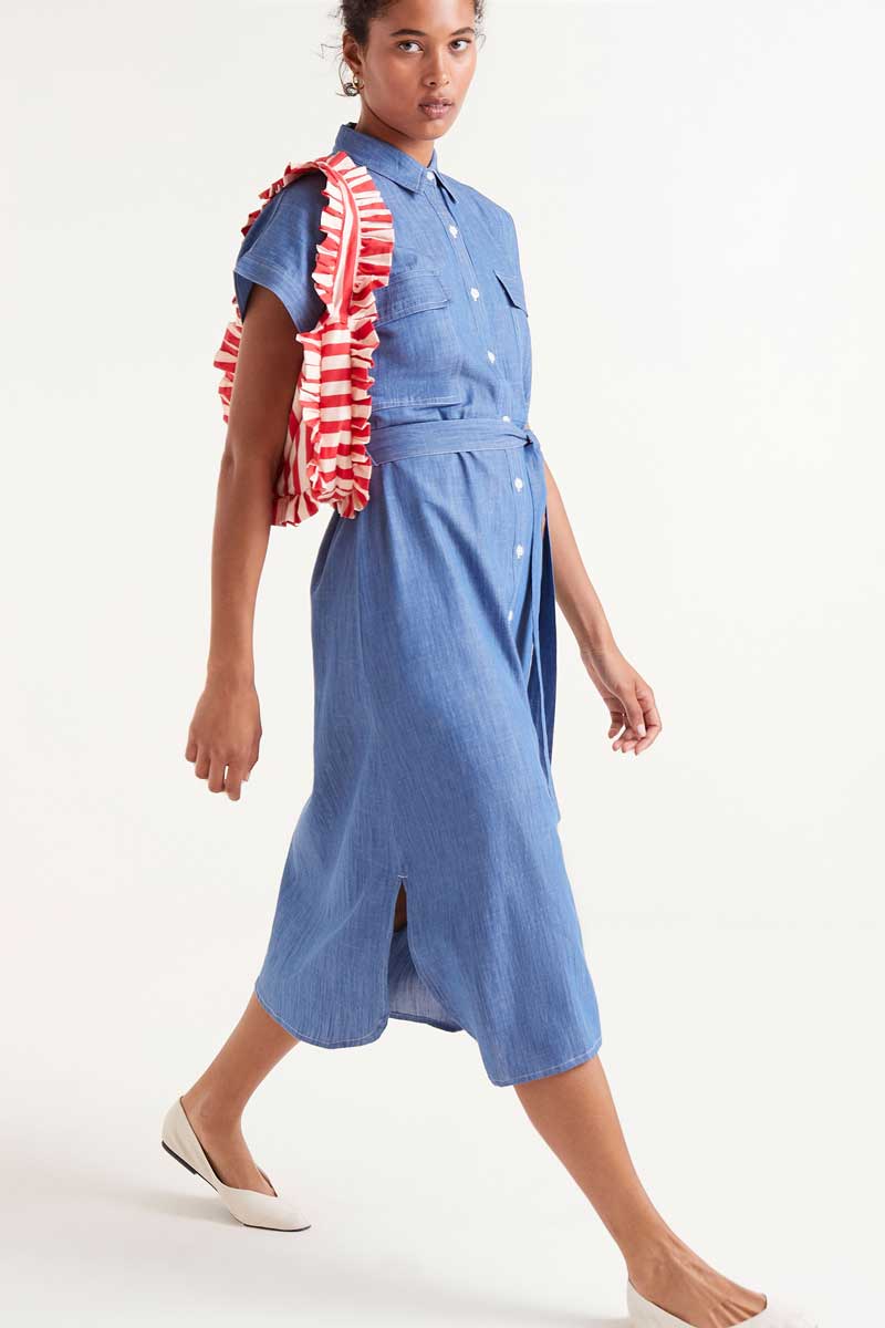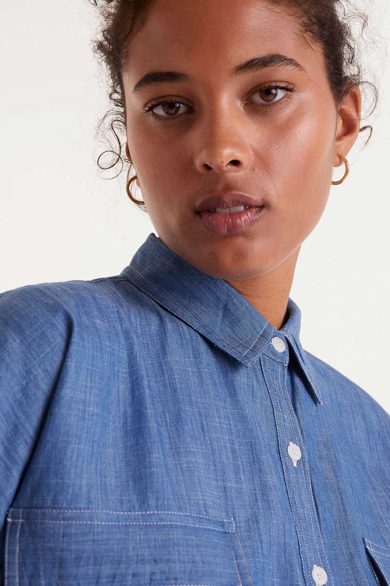 Midi shirt dress in light blue denim fabric. With lapel collar and short sleeves. Front button and belt closure. Front patch pockets. Side slit detail.