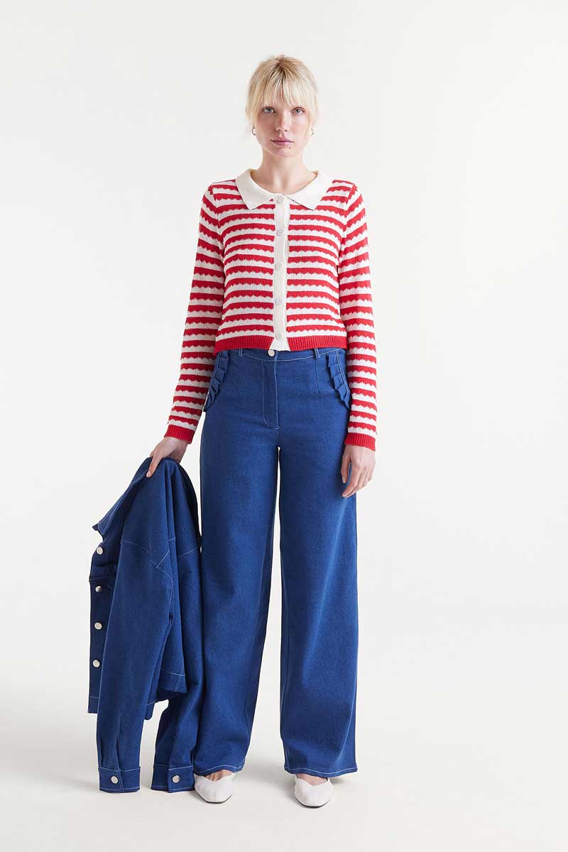 Long trousers in blue stretch denim fabric. With a fixed, mid-rise waist and straight leg. Front zip and button closure. Side pockets with ruffle detail.