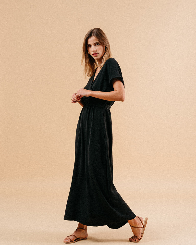 The silhouette: The MAUD maxi dress with its elasticated waist is the perfect blend of femininity and comfort. We love the light, flowing fabric that gently hugs your curves and the waist belt that enhances your silhouette. Its short sleeves reveal your arms to let them soak up the sun on a hot summer's day. The MAUD maxi dress joins our ""Collective"" range, a certified 100% eco-responsible line.