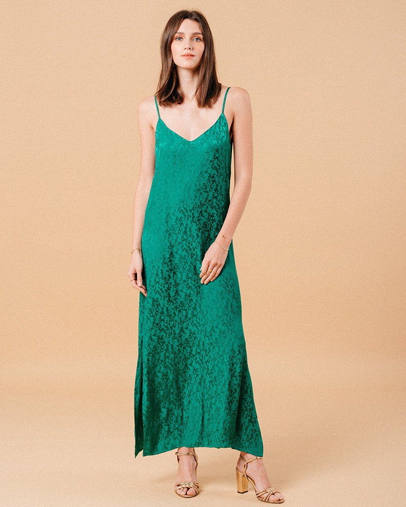 The silhouette: The MICHAELA dress is one of our crush of the collection. We love the slits on the sides that give a very sensual and glamourous silhouette. Its loose fit will enhance every women body while its V-shaped opening will beautifully highligh the back. With its delicate iridescent fabric, this sleeveless dress has everything you need. MICHAELA is a sumptuous dress in viscose that joins our 'Un Brin de Vert' range in natural fibres.