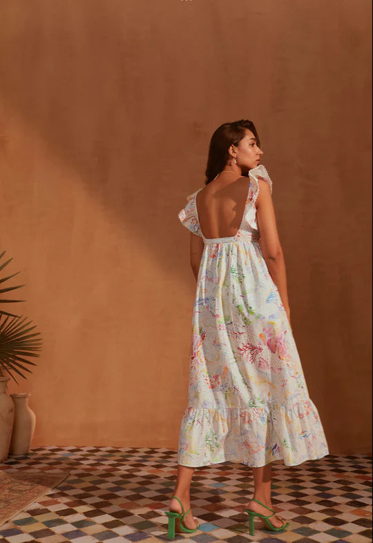 Featuring our signature ruffle sleeves and a fit and flare silhouette, the Elora is our go to maxi dress this season. Seen in a subtle Butterfly Effect print in white, this is the perfect dress for your next summer getaway! The dress is made from the softest cotton poplin and features a low back and smocking detail on the bust.