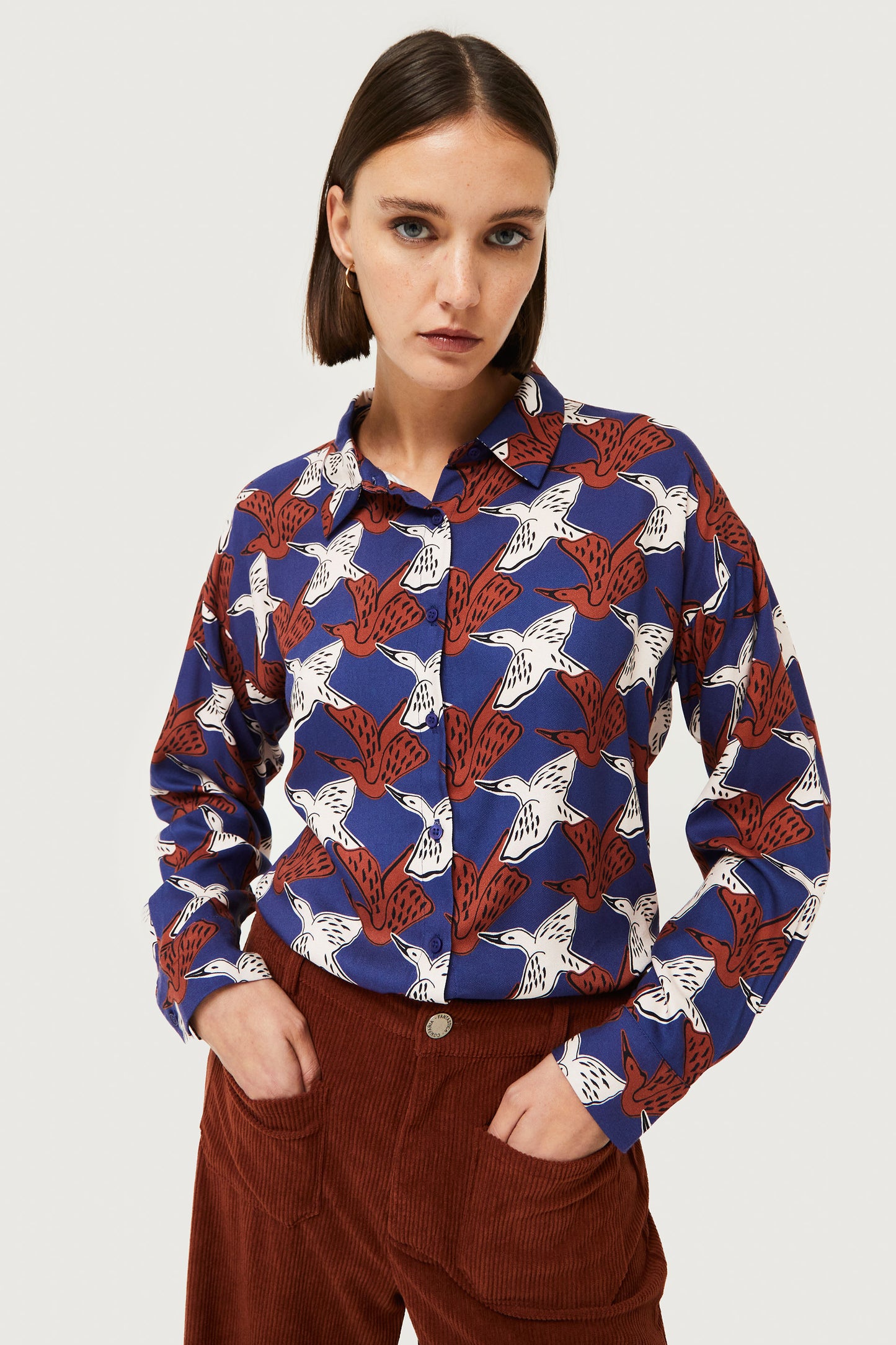 Blue viscose twill shirt with brown and white animal print. With lapel collar and long sleeves ending in cuffs. Front button closure. The model is 176 cm tall and wears size S.