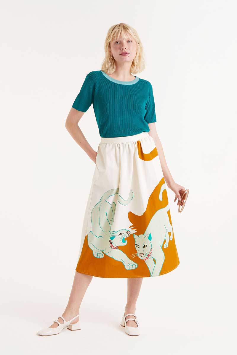 Midi skirt with Jaguar print. With elasticated mid-rise waist. Straight cut. Side pockets.