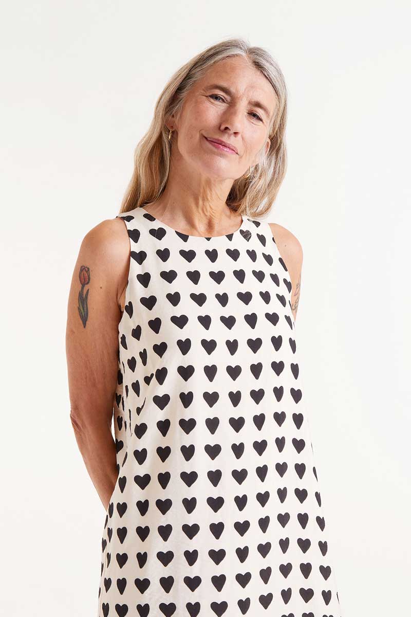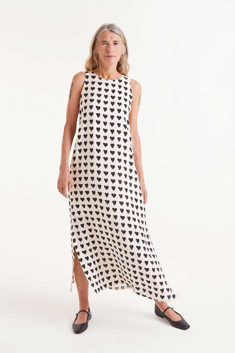 Long, flowing dress in light crepe with a heart print. Round neck and sleeveless. Back closure with slit and button. Side slit detail.