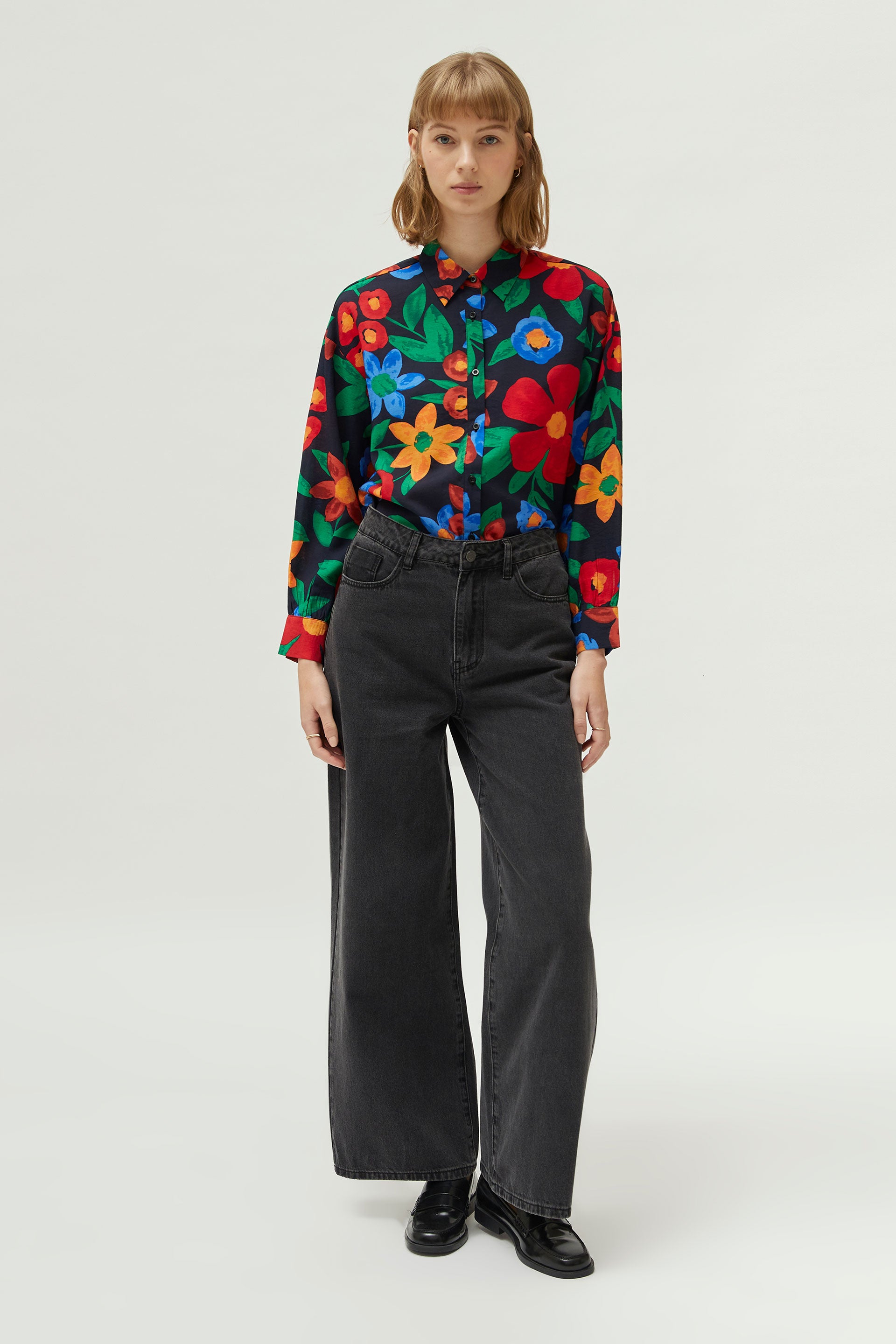 Viscose crepe shirt with multicolored flower print. With lapel collar and long sleeves. Front button closure. The model is 177 cm tall and wears size S.