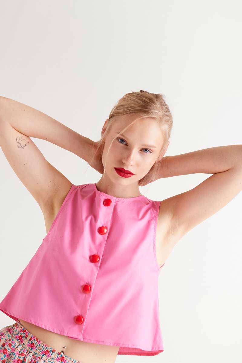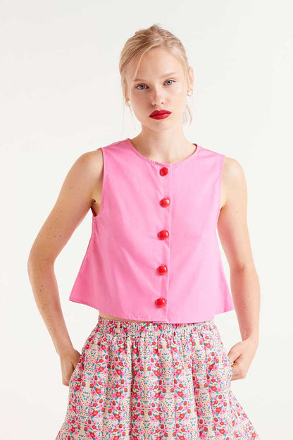 Pink cotton poplin crop top. Round neck and sleeveless. Front closure with decorative red buttons.
