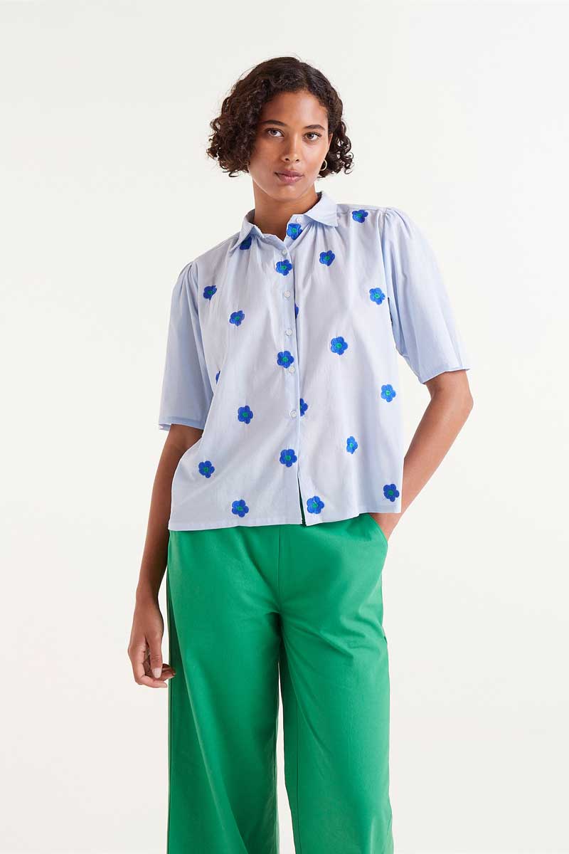Blue shirt with embroidered flower print. With lapel collar and short puffed sleeves. Front button closure.