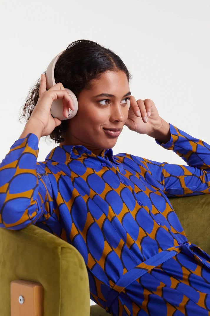 Skouros Small print maxi dress. Viscose jersey fabric. Lapel collar and long sleeves. Front button closure and tie waist. The model is 175 cm tall and is wearing a size S.