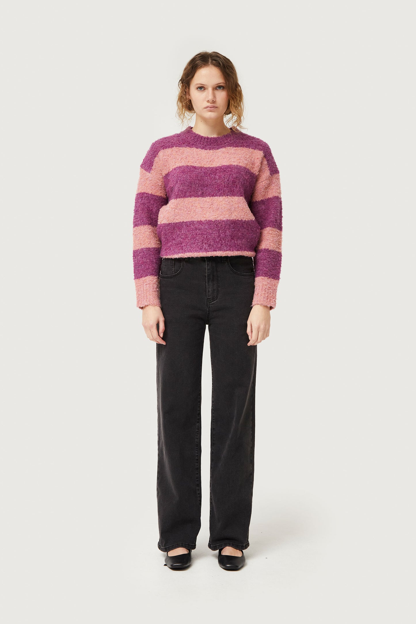 Washed black long jeans. With a mid-rise waist and straight leg. Button and zipper closure. Side and back pockets and belt loops. The model is 175 cm tall and wears size S.