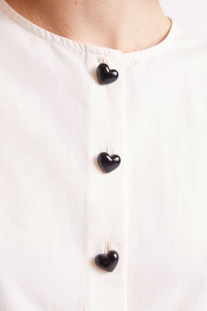White cotton poplin crop top. Round neck and sleeveless. Front closure with decorative black heart buttons.