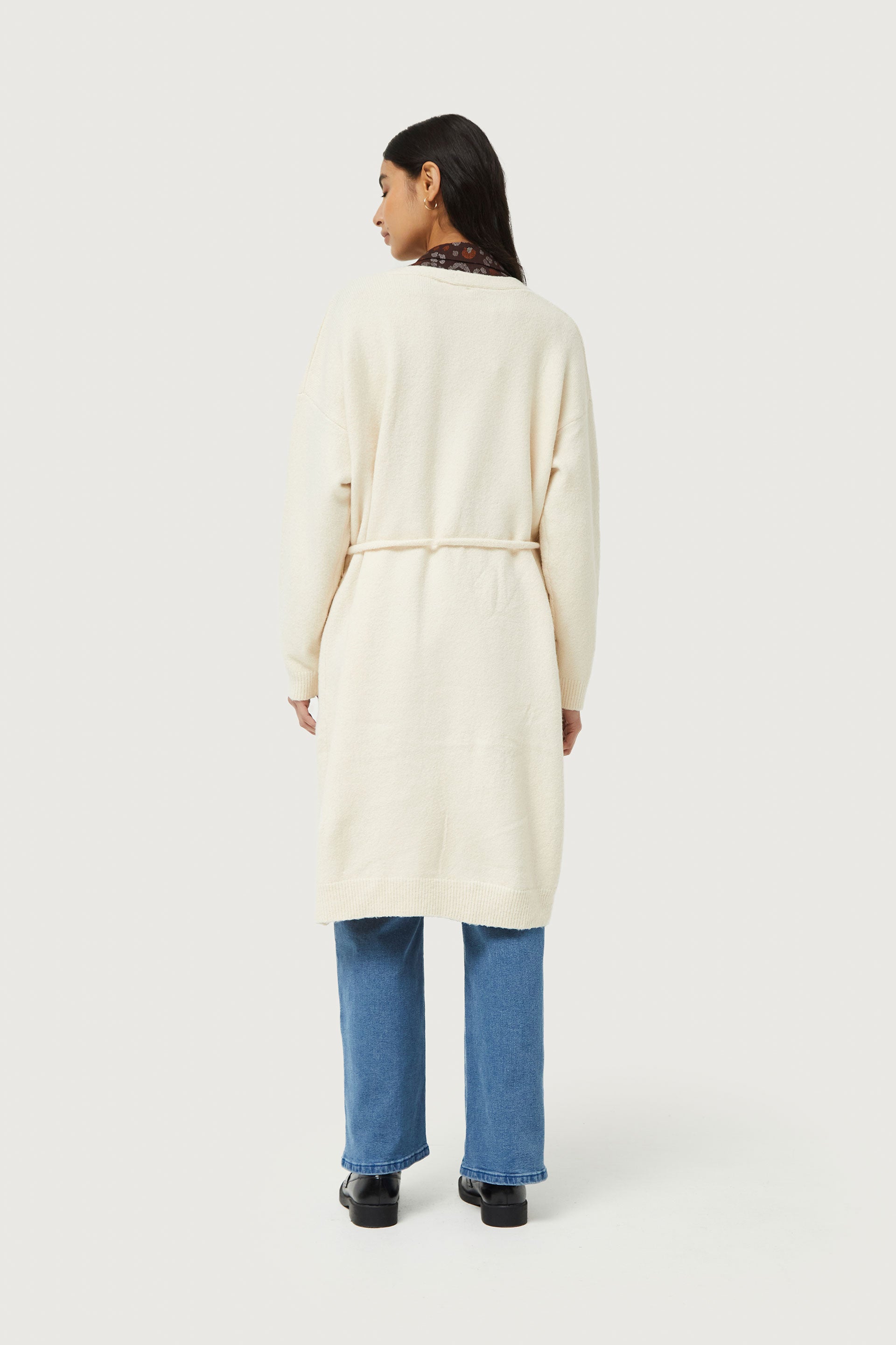 White knitted midi jacket. With open neckline and long sleeves. Belt closure. The model is 176 cm tall and wears size S.