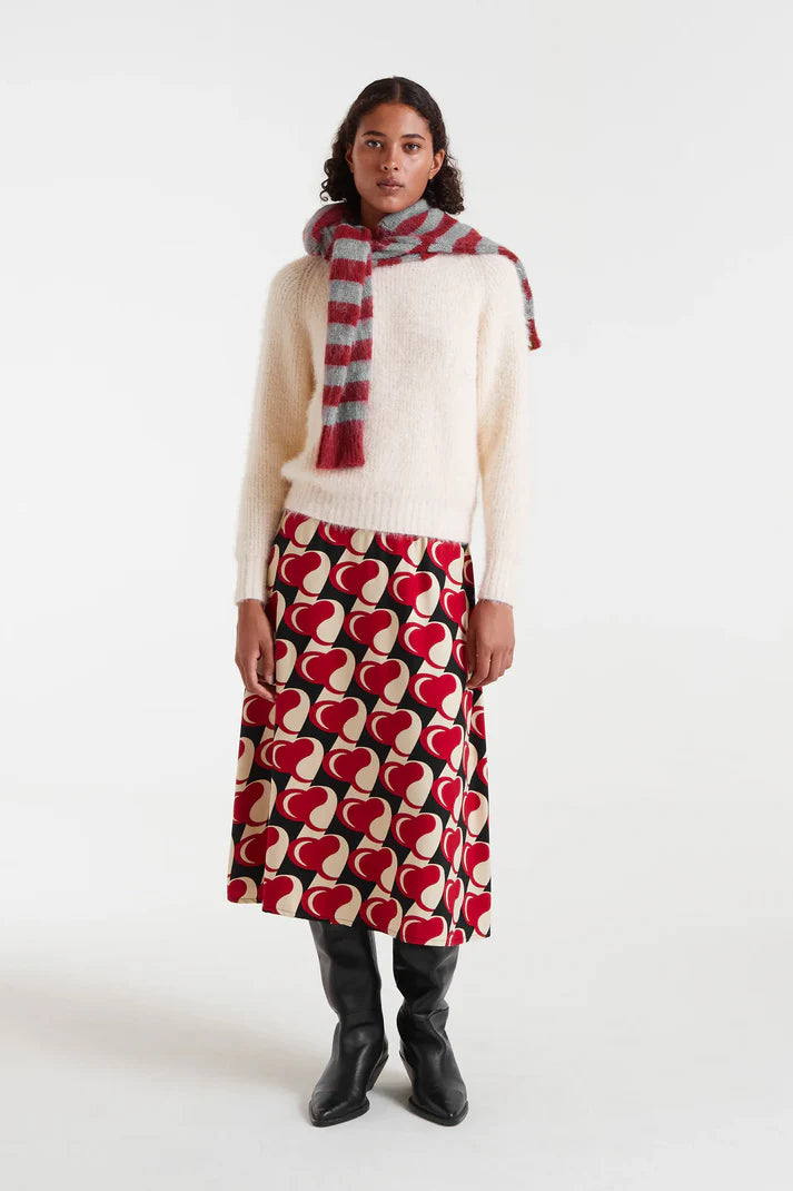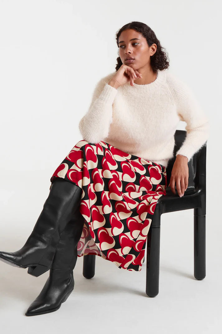 White textured knit sweater with a round neck and long sleeves. Ribbed details. The model is 175 cm tall and is wearing a size S.