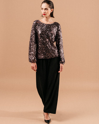 How to wear a long-sleeved sequin top? At Grace&Mila, the LUDMILA top is styled with LOGAN trousers or LORENZO trousers to play the sequin card to the hilt. We like to add a pretty pair of black pumps, sober and elegant.